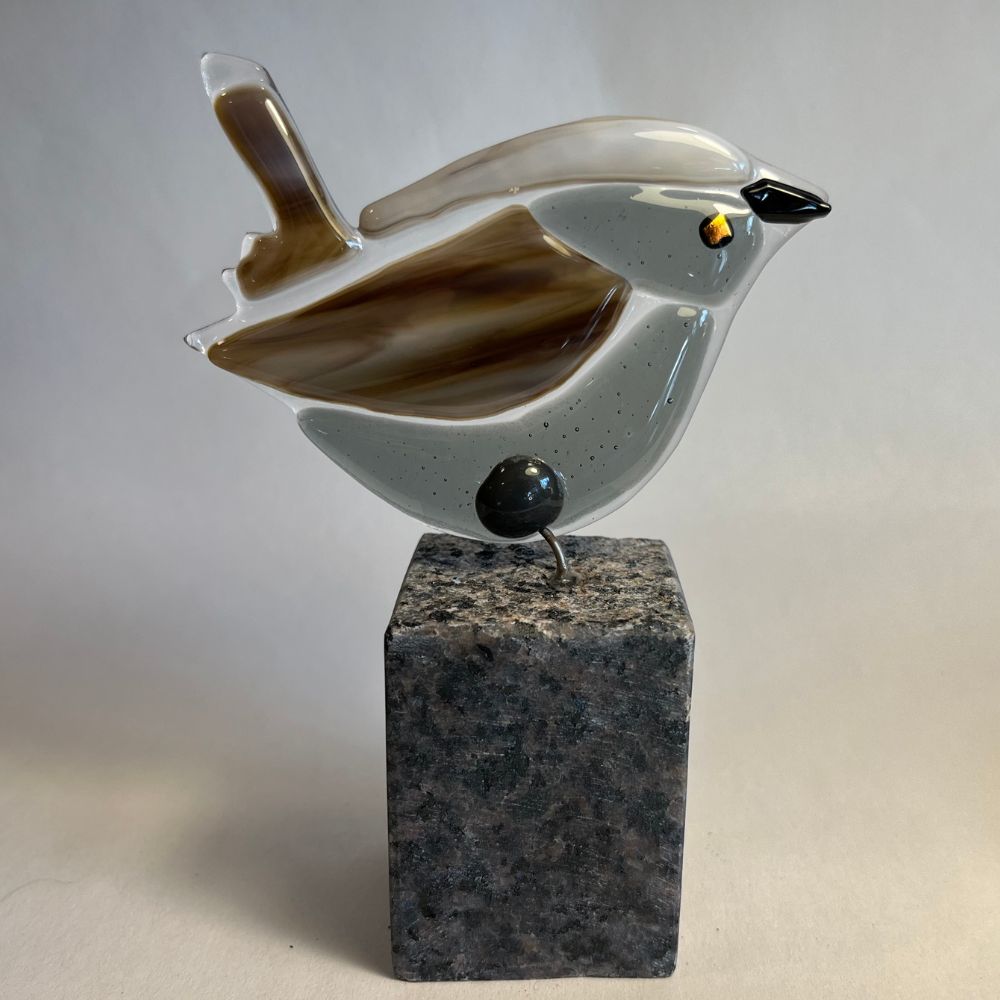 Smuk glasfugl på granitsokkel. størrelse 5*10*14 cm.