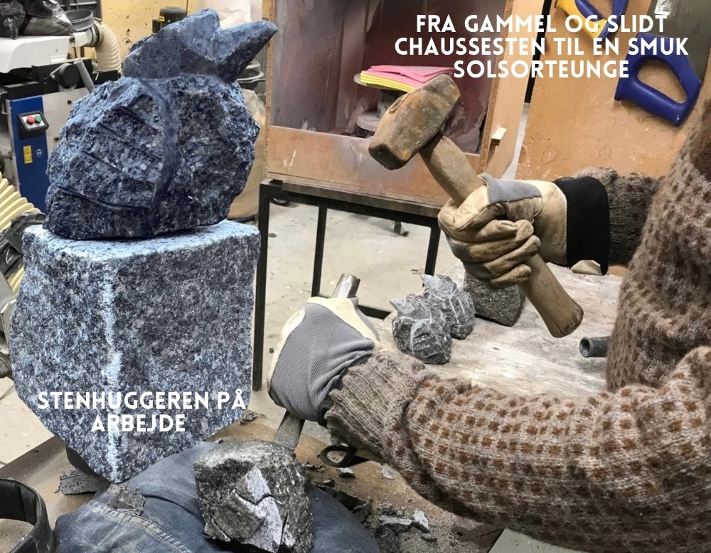 Hos os på stenhuggeriet i Øster Jølby, tog Michael Røntved den i hænderne og skabte denne lille pjuskede solsorteunge, som nu er din. Pas godt på den, og hvis den skal forblive mørk i farven, skal du engang imellem give den lidt olie. Vi har fra starten behandlet den med en blanding af linolie og terpentin.